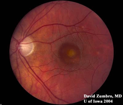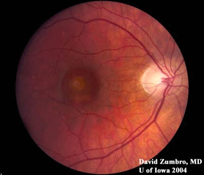 临床特征:30岁女性因双侧黄斑损害而就诊。现病史:30岁女性在常规检查中发现有双侧黄斑损害。无视力方面的主诉。否认有夜盲病史,家族史中无眼病。既往病史:健康;家族史: 无关