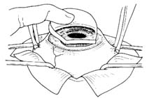 将前房角镜(以barkan前房角镜为侧)轻轻放于角膜上。镜子应偏向角膜鼻侧部分,以便前房角切开刀从暴露的颞侧角膜宽约2mm的半月形部分进入前房。术者左手示指可固定前房角镜。