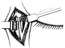如鼻泪管通畅,只作泪小管泪囊吻合术即可。若鼻泪管阻塞,则按本法进行。先作泪小管泪囊吻合术(参考该术式,但暂不缝合)。再按泪囊鼻腔吻合术分离骨膜、造骨孔、作泪囊和鼻粘膜瓣,在泪囊颞侧壁上可看到切下泪总管后留下的小圆孔。
