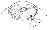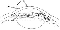 ⑶如果为线状虹膜粘连,又难于分离,可在粘连一端角膜缘做一2mm的水平切口,向虹膜粘连的两侧注入少许粘弹剂,剪刀两刃分别从粘连线一端的两侧伸入前房,一直伸到粘连线结束端以外或直达对侧房角,闭合剪刀,一次剪开粘连虹膜(图3)。
