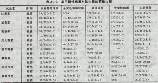 (二)药物敏感试验 我们总结同仁医院眼科门诊自1995~1999年的5年间,从角膜溃疡分离出细菌株用临床上常用数种抗生素进行药物敏感试验(见表3—1—3,表3—1—4)。 (三)药物治疗原则 目前眼科最常用的抗生素有三大类,氨基糖苷类、氟喹诺酮类和头孢菌素类药物:氨基糖苷类药物为广谱抗生素,对绿脓杆菌有效。近10年来,氟喹诺酮类药物应用于眼科临床,该类药物抗菌谱广,对于革兰阴性杆菌包括绿脓杆菌和部分革兰阳性球菌均有良好的抗菌作用。由于该药广谱有效,药物商品化易得,使用经济方便,近年来已成为临床抗菌首选药物,特别在基层和私人医院应用更普遍。头孢菌素类抗生素的抗菌谱比青霉素广,作用也比青霉素强,目前已研制出第四代头孢菌素。头孢菌素类的抗菌特点是,对革兰阳性球菌的抗