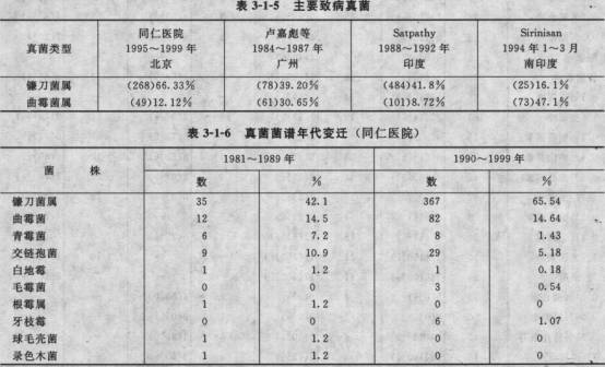 对初次治疗的急性期患者,在病原菌尚不明确,细菌培养、药敏试验的结果还没有出来,或基层医疗单位,没有条件进行病原学分析的情况下,应首选广谱抗菌药物,并采取不同种类抗生素、兼顾球菌和杆菌的联合用药方式,给药途径包括点药、结膜下注射,对于伴有大量前房积脓者,同时给予静脉输液,以求尽快控制感染,将视力损害减少到最低。我国眼科临床长期以来主要应用庆大霉素,但耐药菌株逐年增多,目前已由妥布霉素替代作为首选药物,同时应选用另一种抗革兰阳性菌的药物联合使用,如头孢菌素类药物。在欧美国家临床治疗细菌性角膜溃疡常规用药为强化妥布霉素(1.3%~1.5%)和头孢唑啉(5%~10 9/6)。这种联合用药针对常见G+菌和G一菌均有效,而且应用高浓度滴眼剂可达到较高组织浓度。也可选用氟喹诺酮类药物,如环丙沙星或氧氟沙星,曾有文献报道显示,强化妥布霉素和头孢菌素联合应用,其效果与单独应用0.3%环丙沙星或氧氟沙星相同。现今临床上对如何选择合适抗菌药物意见不相一致,有些学者认为,在溃疡较小且位于角膜周边部,对视力无损害时,可考虑单用氟喹诺酮类药物治疗。但当溃疡面积较大,位于角膜中央或旁中央,对视力威胁较大时,应把强化妥布霉素和头孢菌素作为首选药物。值得注意的是,氟喹诺酮类药物由于使用过多,耐药菌株正逐年上升,而且该类药物对部分革兰阳性菌特别是肺炎链球菌及某些链球菌属不敏感。文献报道中可看到,目前外眼感染中肺炎链球菌危险性有所增加,包括角膜移植术后缝线脓肿,白内障术后大泡性角膜病变,也常见于泪囊炎和滤过泡感染。厌氧性链球菌引致结晶样角膜病变大多数对单用氟喹诺酮类药物治疗无效。因此,单用氟喹诺酮类代替强化抗生素治疗角膜溃疡,并不能代替治疗所有角膜溃疡。结合我国眼科临床实际情况,条件许可还应首选妥布霉素联合利福平/头孢菌素类药物,或氟喹诺酮类联合利福平/头孢菌素类。如果治疗3~5天后,角膜炎症无明显好转或加重,应更改原有药物或根据药敏结果选择用药。如果考虑是耐药金黄色葡萄球菌的感染,应选用万古霉素和阿贝卡星(Arbekacin,ABK),目前公认的治疗耐药金黄色葡萄球菌感染的有效药物只有糖肽类一个类别,其代表药为万古霉素。万古霉素单次静脉注射0.5g,有效血浓度可维持6h;局部可用O.5%~5%的万古霉素点眼,或结膜下注射,每次25mg。阿贝卡星属于氨基糖苷类,是卡那霉素的一种诱导物,对耐药金黄色葡萄球菌感染有效,由于肾毒性和耳毒性较大,一般不全身应用,由于该药的后作用时间长,故认为最适合用来点眼,一般用O.5%滴眼液或10~20mg/0.2ml作结膜下注射。 对于药物治疗后炎症明显好转的患者,在继续应用抗菌素的同时,可加用一些角膜上皮的营养保护剂,如表皮生长因子、唯地息,为减少炎症反应,还可应用非甾体类药物,如双氯芬酸钠等。在确认炎症已得到有效控制的情况下,可谨慎给予小剂量激素,减轻局部炎症反应。 二、真菌性角膜炎 (一)致病真菌 真菌性角膜溃疡常见致病真菌为镰刀菌和曲霉菌。在我国镰刀菌检出率(39.2%-66.33%)已从20世纪80年代逐渐上升,并已超过曲霉菌(1 2.12%~30.65%)占首位,这与美国佛罗里达州南部及印度南部地区相同,但在印度新德里地区曲霉菌仍为首要致病菌。一般丝状真菌引起角膜感染的发病率是随着该地区远离赤道部而下降,在美国北部和加拿大大部地区病原菌为念珠菌,而丝状真菌很少见。其他致病真菌,如青霉菌、交链孢霉菌、毛霉属、根霉属类酵母菌等,而念珠菌少见(见表3—1—5,表3—1—6)。