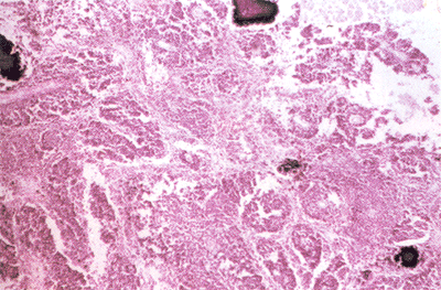 真菊花形及坏死区混在一起,并可见几处钙化,这是临床上诊断母细胞瘤的参考之一。