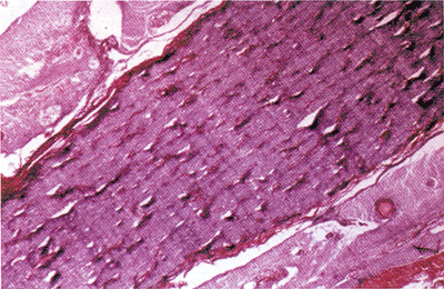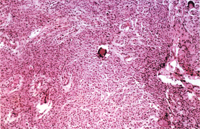 瘤组织在蛛网膜内外生长。较均匀一致的小椭圆形细胞间散在着沙粒体。