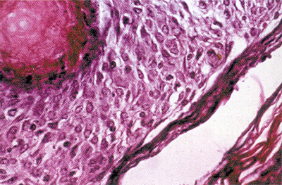 此瘤起源于覆盖硬膜或蛛网膜的内皮细胞,故亦称为内皮细胞瘤。最常见一般是在硬脑膜内,但最后它会向硬脑膜的内外蔓延。因与骨质不接触,它在眶内生长很自由,不引起眶壁的改变。 显微镜下可以看到脑膜瘤是由许多细胞草组成。细胞巢可全无或仅有很少的结缔组织纤维。肿瘤周围可以只被薄壁血管分开,沙粒体在脑膜瘤中是常见的。