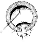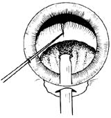 拦截劈裂法(stop and chop)在高负压低能量条件下,将乳化头直接插入晶状体核部分,自辅助切口伸入特制器械(如chopper),从核下极绕过,向乳化头固定方向劈切,使之裂开。旋转一定角度重复这一动作,可使晶状体核劈成若干碎块,然后将其逐一乳化吸除(图13)。