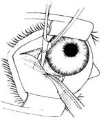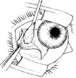 2.用斜视钩分离上直肌和外直肌,将4-0丝线穿过肌腱,作为牵引线。将牵引线向下方牵拉,充分暴露手术部位(图7)。