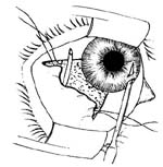 1.做球结膜瓣 手术部位一般选择于颞上象限,也可选择于鼻上象限。置开睑器后,于颞上象限剪开角巩膜缘球结膜和球筋膜,做以穹隆部为基底的球结膜瓣,并于切口的两端(12点与3点或9点位置)向穹隆部做松解切开(图5)。向穹隆部做钝性分离,充分烧灼止血(图6)。