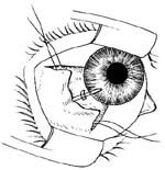 3.固定房水悼念装置 将房水引流装置的板端置于颞上方赤道部巩膜表面。其前端距角巩膜缘为9~10mm。以5-0非吸收缝线于巩膜板层缝两针固定线,穿过房水引流装置的板端前面的小孔,结扎固定(图8)。