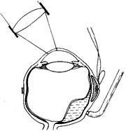 视网膜脱离较高,作了巩膜环扎或外加压后,裂孔部仍有较多视网膜下液,影响裂孔与脉络膜闭合,此时应作视网膜下液引流术(drainage of subretinal fluid)。