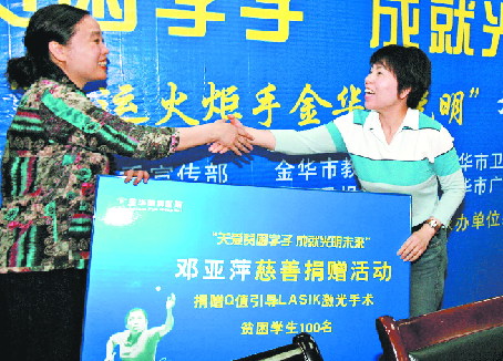 从2005年起,邓亚萍已连续4年来我市举行“关爱贫困学子,成就光明未来”激光近视治疗慈善捐赠活动。在她的资助下,目前我市已有30名家庭贫困、品学兼优的学子接受了鹰视酷眼激光手术治疗。今年的“关爱贫困学子,成就光明未来”邓亚萍激光慈善捐赠活动由市委宣传部、市教育局、市卫生局、市慈善总会、金华日报社、金华广播电视总台联合主办,美国科医人医疗激光公司协办,金华眼科医院承办。