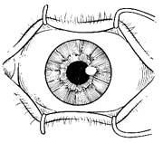 或以缝线开睑。缝线开睑须在上下睑皮下浸润麻醉后进行,上睑作1~2个,下睑作1个褥式缝线,距睑缘3mm(图2)。