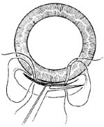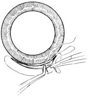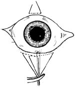 2.上直肌固定缝线 以直齿镊于12点时钟位角膜缘后8mm处夹住上直肌肌腱,以圆针带1-0丝线贯穿上直肌附着点后方,缝线作牵引上直肌(图3)。