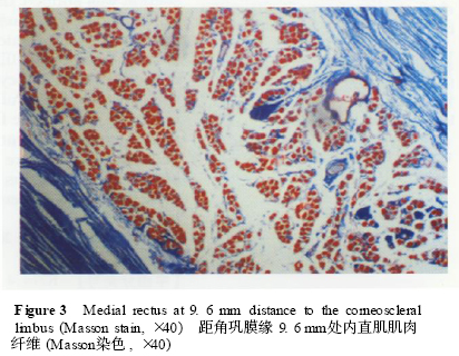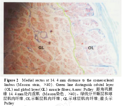 2. 1 Pulley与直肌肌肉纤维组织结构 距角巩膜缘14. 4 mm处的眶中部,直肌肌肉纤维分为眶层肌肉纤维及球层肌肉纤维,眶层肌肉纤维位于肌肉靠近眶壁侧,呈“C”型包绕球层肌肉纤维,在各直肌中以内直肌肌肉纤维最为典型(图1) ,眶层肌肉纤维起源于眶尖,于眶中部与各自的Pulley融合,高倍镜下可见眶层肌肉纤维由蓝色的Pulley包绕,肌肉纤维细小,染色呈暗红色; 而球层肌肉未见Pulley包绕,纤维直径粗大,染色呈亮红色(图2) 。球层肌肉纤维起源于眶尖贯穿整个直肌肌肉全长,于眶中部穿过Pulley以肌腱的形式止于眼球,在距角巩膜缘9. 6 mm处,内直肌均为球层肌肉纤维,肌肉纤维呈单一均匀的亮红色,纤维直径大小一致,未见Pulley包绕(图3) 。