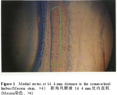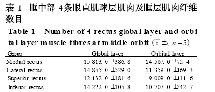 1. 4 4条眼直肌眶层肌肉纤维及球层肌肉纤维数目的统计 应用Masson 染色的全眼眶冠状位连续组织切片,于眶中部(眶尖至各直肌肌腱巩膜附着点的中点平面) ,应用M IAS22000显微图像分析系统,测量4条眼直肌眶层肌肉纤维及球层肌肉纤维数目。