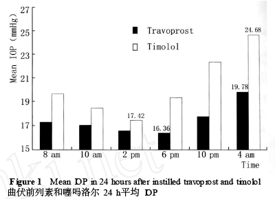 新近研究表明,较大的昼夜IOP波动是重要的独立危险因素,也是导致视野损害进展的主要原因[ 3, 9 ] 。24 h IOP测量发现大多数患者在8 am以前或5 pm以后均出现21 mmHg以上的峰IOP[ 10 ] 。在夜间出现的IOP高峰正是造成视野损害的主要原因。我们的研究结果显示:治疗组昼夜IOP波动值在3. 42 mmHg左右,在健康人的IOP波动范围(3. 7mmHg)内,在4 am 也能高效降低IOP 5. 55 mmHg(约21. 9% ) 。说明曲伏前列素可稳定的降低昼夜IOP,和文献报道[ 11 ]的IOP波动3. 6 mmHg相近。对照组的昼夜IOP波动是7. 26 mmHg,在夜间10 pm到4 am的IOP超出有效范围,特别在4 am IOP高达24. 68 mmHg与基线IOP接近,表明噻吗洛尔夜间几乎无降压作用。这提示曲伏前列素比噻吗洛尔能更好地预防患者视功能的恶化。