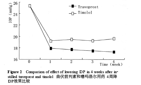持续4 周治疗, 曲伏前列素组平均降低IOP8106 mmHg,降压幅度为31. 8 %;噻吗洛尔组平均降低IOP 5. 8 mmHg,降压幅度为22. 9% , 2组间比较有显著差异,表明曲伏前列素滴眼液的持续降IOP效果明显优于噻吗洛尔,曲伏前列素可高效降低IOP。Netland 等[ 12 ] 报道IOP 降低6. 6 ~8. 1 mmHg, 而Goldberg等[ 13 ]报道IOP降低可达9 mmHg ( 33%) ,我们的结果与之相近。曲伏前列素组4 周内平均IOP曲线略呈下降趋势,而噻吗洛尔组4 周内平均IOP曲线略有升高趋势。有报道噻吗洛尔长期应用有漂移现象,前列腺素类药物暂无此类报道,曲伏前列素的远期效果还有待于在今后的应用中进一步观察。