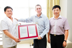 图为约翰·戴维斯向天津眼科医院送感谢信时与该院领导合影留念