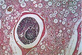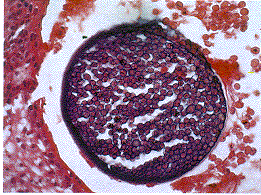 手术切除此损害并行组织学检查。显微镜下可见到在粘液纤维瘤基质中有许多大小不等的圆形壳质结构被慢性炎性细胞围绕并内含孢子样体(图2)。这些表现是典型的鼻孢子虫病,一种西伯氏鼻孢子虫引起的霉菌感染1,2。这些小球代表包含有内孢子的孢子囊(图3),当此孢子囊成熟时即将内孢子释放到感染组织2。