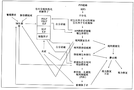 图 增殖性玻璃体视网膜病变(PVR)通路图。通路中孔源性视网膜脱离(RRD)是启动事件。