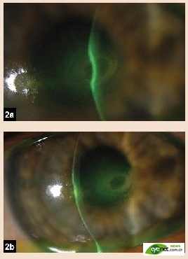 图2,右眼的裂隙灯照片。角膜溶解的范围清晰可见。2a中的角膜变薄区比2b中见到的更深更大。
