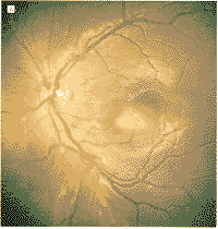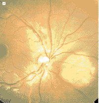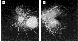 1994年12月18日,随诊检查1例3岁调节性内斜视日本女童时,发现双侧脉络膜病变,除血清肌酸磷酸酶升高外,其病史无特殊。每只眼均可见1个扁平黄色脉络膜病变(图1)。荧光血管造影检查显示两眼病变在早期呈低荧光,晚期呈高荧光(图2)。由于阻塞,吲哚花青绿血管造影检查,早期显示低荧光,晚期发生病变染色(图3)。超声检查(A超和B超)显示双侧明显的脉络膜病变,有高的内反射,符合钙化。计算机断层扫描显示双眼内有钙质沉积(图4)。在T1权重的核磁共振图像显示病变被钆(gadolinium)轻度增强。根据这些发现,诊断为脉络膜骨瘤。约2年后,双眼病变明显增大(图5),由荧光素和吲哚绿血管造影检查所确定。此时,双眼矫正视力仍为20/30,没有弱视的征象。对患者进行随诊,对肿瘤未予治疗。