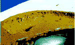 图4 脉络膜黑色素瘤由眼球黑变病发展而来。由致密的色素增生的色素痣包绕的轻度色素沉着的卵圆形病变,很明显是梭形细胞黑色素瘤。在后部巩膜表层内可以看到广泛的线形色素沉着符合眼-皮肤黑变病