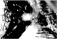 我们对病人初次检查时,其双眼最佳矫正视力20/20,左眼外眦部轻度肿胀,在外眦周围皮肤上有少量干燥的结痂(图1)。眼外运动充分,容易将双眼推回眶内。没有突眼。触诊显示外眦部有一小的、无触痛性肿块。活组织显微镜检查显示左眼结膜中度充血。有白色脓性物质通过外眦部结膜一个针尖大小的区域排出(图2)。右眼活组织显微镜检查和双眼检眼镜检查均正常。眼眶的计算机X线断层照相术扫描显示无异常(图3)。