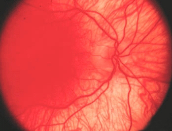 注释:视网膜色素上皮细胞黄斑区色素缺乏,脉络膜血管可见,中心凹反射消失。
