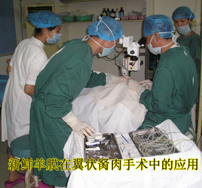 翼状胬肉为结膜变性组织,多数学者认为与紫外线、干燥、风尘刺激有关。Solomm曾报道:翼状胬肉复发与免疫学有关,且属于Ⅰ型变态反应[2],临床上没有理想药物控制,常规手术切除复发率高。近年来,羊膜移植在眼表面重建中取得良好效果,展现了广阔的应用前景,羊膜具有一定韧性,透明度好,羊膜中厚的基膜及无血管基质,可以防止翼状胬肉纤维组织增生,减少了瘢痕形成,无淋巴细胞,抗原性低,从而不易产生排斥反应,厚的基膜还有利于健康的上皮细胞增生,在眼表面重建中起到重要的作用,新鲜羊膜含有多种蛋白成分,具有很好抗粘连、抑制局部炎症及新生血管形成,同时其他完整的活性上皮层,可以有效而快速帮助上皮重建,并能为其营养提供支持,羊膜移植术后于眼表面吸收部分药液,更有利于炎症消退。羊膜是一种生物膜,没有排斥反应,取材容易,制备简单,手术过程简便、安全,新鲜羊膜含有更多活性成分,且不用长期保存,在翼状胬肉手术中便于发挥更好的疗效,是目前翼状胬肉手术较为理想的选择,便于临床推广应用。