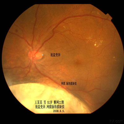 一例极少见的眼底病患者——患者为糖网II期,左眼同时存在视盘变异和网膜脉络膜缺损.