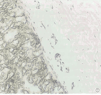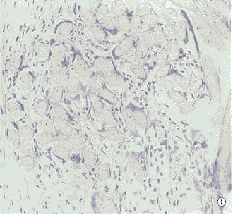 第3组植入片与巩膜之间以及植片结构间隙有较多的炎性细胞,随着时间延长,炎性细胞成分减少,植入片与巩膜之间可见潜在腔隙。植入物结构与巩膜的区别明显(图2)。