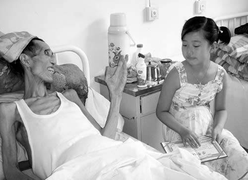 去年3月,王国民无故呕吐,体重骤降,去医院检查结果是:骨癌!没钱治病,王国民只好拖着,逐渐丧失了生活自理能力。8岁的小王菲开始洗衣、做饭,并听从病床上父亲的“指令”,像模像样地炒菜。