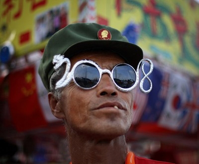 奥运迷男子带着2008图饰的眼镜
