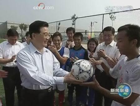 胡锦涛在足球上写下“自强不息奋勇争先”8个字激励残疾人运动员。