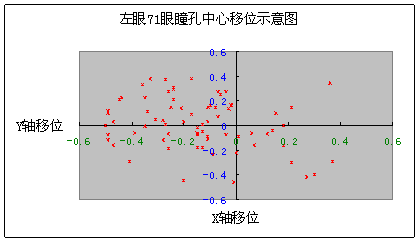成功定位的71只左眼中,在X轴未发生移动者1眼(1.4%),正向移动者14眼(19.7%),负向移动者56眼(78.9%),移动平均值为-0.15±0.22mm (-0.50mm~0.37mm);在Y轴未发生移动者2眼(2.8%),正向移动者37眼(52.1%),负向移动者32眼(45.1%),移动的平均值:0.02±0.21mm。(-0.46mm~0.38mm)。如果按位移的绝对值进行计算,左眼X轴平均位移为0.22±0.14mm(0~0.50mm),Y轴平均位移为0.17±0.12mm(0~0.46mm),平面位移为0.301±0.141mm(0.085~0.505mm)。见图2-2。