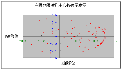 成功定位的76只右眼中,在X轴发生正向移动者65眼(85.5%),负向移动者11眼(14.5%),移动的平均值:0.28±0.22mm。(-0.31mm~0.50mm);在Y轴未发生移动者1眼(1.3%),正向移动者34眼(44.7%),负向移动者41眼(53.9%),移动的平均值:-0.01±0.22mm。(-0.47mm~0.48mm)。如果按位移的绝对值进行计算,右眼X轴平均位移为0.32±0.15mm(0.01mm~0.50mm),Y轴平均位移为0.18±0.12mm(0~0.48mm),平面位移为0.392±0.133mm(0.064~0.539mm)。见图2-1。