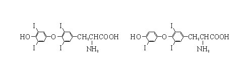 本品主要成份为:甲状腺素和三碘甲状腺原氨酸。其化学名称为:3,5,3,'5'-四碘甲状腺原氨酸(甲状腺素、T4) 3,5,3'-三碘甲状腺原氨酸(T3)