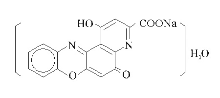 本品主要成份为吡诺克辛钠。其化学名称为:1-羟基-5-氧-5H-吡啶并-[3,2-α]-吩噁嗪-3-羧酸钠(一水合物);