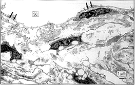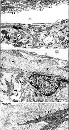 在这些部位,多数筛状细胞包含大量附着于细胞膜致密处的胞浆内微丝。这些细胞部分被基底膜样物质包绕,很象肌纤维母细胞(图3,下)。