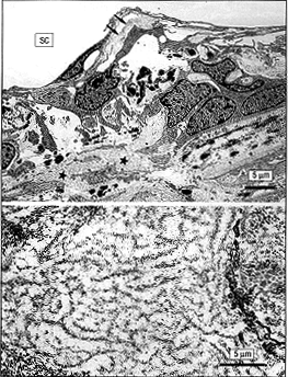 图1 上图,一63岁女性患者(病例156/90-18)右眼Schlemm管(SC)内皮下区的电子显微照片。