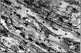 图2 一13岁女性患者(病例2646)左眼角巩膜小梁网的电子显微镜照片,该患者为局部用药引起的皮质类固醇性青光眼。照片显示小梁网间隙被细胞外物质填充(星号),仅可见很少光学空隙通道(箭头)。在一些部位,小梁板芯未被小梁细胞完全覆盖(箭号)(原物放大7500倍)