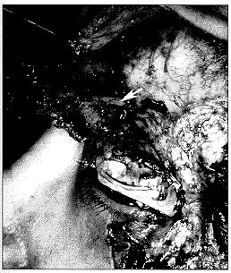 轴向及冠状位CT扫描显示骨、鼻中隔软骨缺失,以及正常筛骨和筛窦组织的广泛缺损(图4),左眶内壁和底壁缺失。左眶内壁软组织肿块活检显示致密纤维变性并伴有慢性炎症反应,累及部分骨骼肌。因为持续的眼眶疼痛和对全身使用皮质类固醇类药物治疗缺乏反应,所以使用了颅骨膜瓣来隔离眶内组织与外界环境。通过额筛窦切开暴露眶内壁及下壁。行双冠切开,用Bovie烧灼器画出一个大矩形颅骨膜瓣,然后通过额筛切开处将瓣膜转位并插入眶内(图5)。这个颅骨膜瓣被挤在眶底后部和眶周组织之间,在眶内位置固定。术后鼻内检查可见一层光滑的粘膜化组织衬于眶内壁和底壁之间。该患者呼吸时不再感到眼部不适。