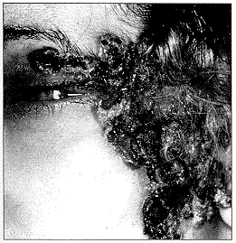 图6 例2广泛的结节状溃疡性基底细胞癌,混有结痂、溃疡及红斑