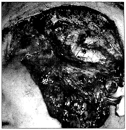 图7 Mohs显微切除术后的缺损。缺损上缘超过眶上缘1cm以上。准备帽状腱膜颅骨膜瓣时对额神经的保护在此已不成为问题