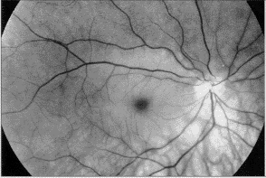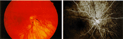 图1 左,右眼的无赤光图像显示倾斜的视盘和具有一符合樱桃红点的暗斑的视网膜后极部白色水肿。右,荧光血管造影(48秒)显示动静脉转换时间的明显延迟