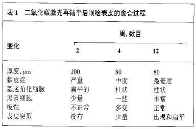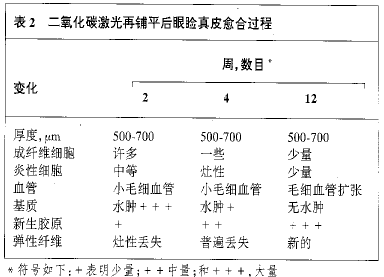 没有患者感受到激光皮肤再铺平或睑成形术的任何不良的反应。所有患者对他们最终美学效果均感到满意。患者平均年龄63岁(范围,45~84岁)。除1例之外,所有患者属于Fitzpatrick Ⅱ型皮肤。皮肤再铺平后上皮再形成持续时间平均6.9天(范围,4~10天)。观察到的上皮再形成的持续时间或病理组织学变化无性别差异。由于激光皮肤再铺平后1周获得的标本显示表皮没有很好地愈合,这些资料不包括在本文中。表皮的愈合和真皮的愈合分别讨论(表1和表2),4周结果的讨论没有提供用作说明的组织学标本。