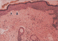 图2 眼睑皮肤激光再铺平后3个月,几乎正常的表皮突很明显。出现一些正常成熟的柱状基底角化细胞(大箭头)。在真皮表皮交界处可见到散在的黑素细胞(苏木精-伊红,原大×8)