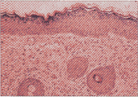 激光再铺平后2周,表皮有明显的改变(图1)。正常表皮突消失和表皮灶性增厚。与毗连的未照射激光的皮肤厚80μm比较,新的表皮平均厚100μm。未注意到有柱状基底角化细胞,与再生上皮相符。有少量黑素细胞,但偶见明显的成簇的黑素细胞。表皮的极性是不正常的。激光再铺平后4周、灶性棘皮症持续存在,但在其他区域,表皮是正常的80μm厚。在基底层,角化细胞再次变为柱状并有明显的黑素细胞。同样,正常的波浪形表皮突结构也再形成。极性呈变异性。激光再铺平后3个月,先前表皮的变化几乎完全正常化,仅有最轻度的棘皮症(图2)。表皮突呈轻度的波浪形,但较健康的、未经治疗的皮肤平坦。注意到有黑素细胞全部补足和极性正常的表皮。
