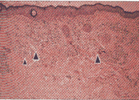 图6 眼睑CO2激光再铺平后3个月,有新的弹力纤维沉积(箭头)(Shikata,原大×4)